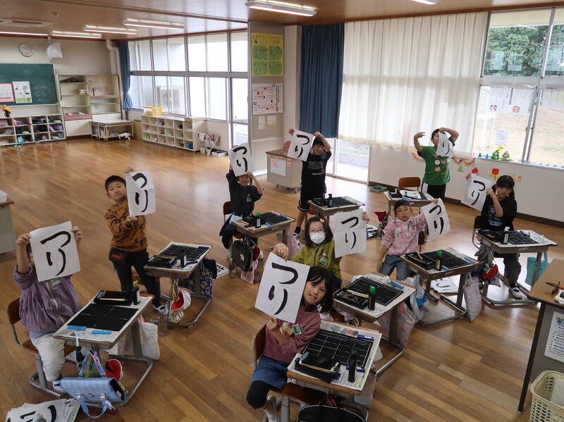 今回は「丸み」の筆づかいで、漢字ではなく、丸みのある平仮名を書きます。文字は「つり」です。丸みのある平仮名の特徴を筆であらわします。文字自体は簡単ですが、丸みを意識するのはけっこう難しいですが、子どもたちは真剣に半紙に向かいました。