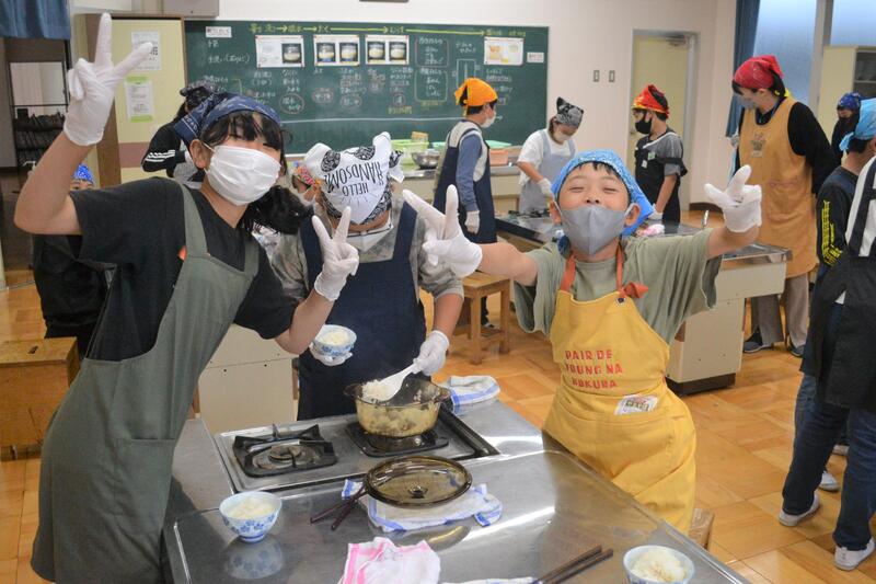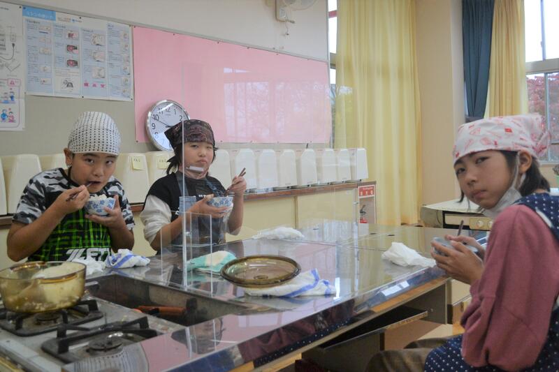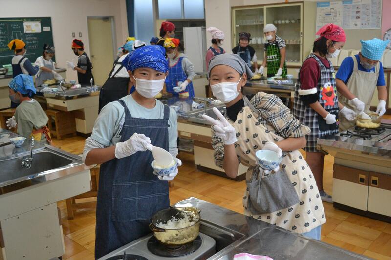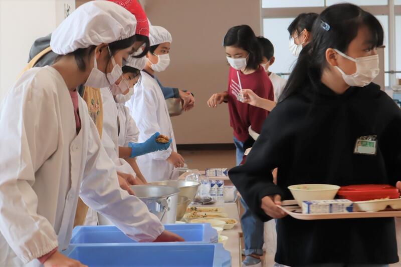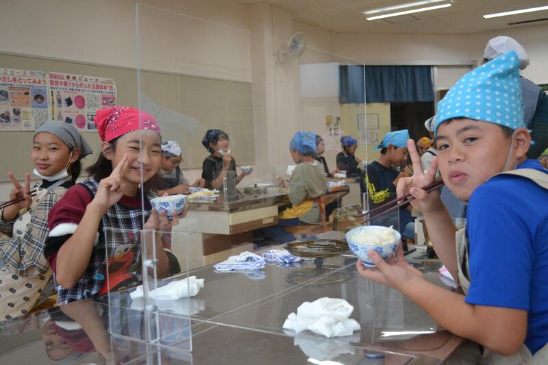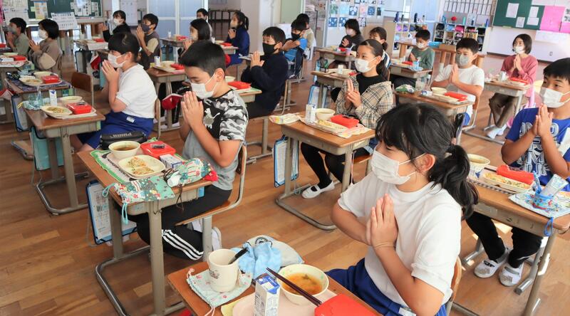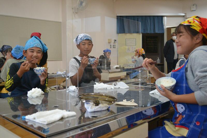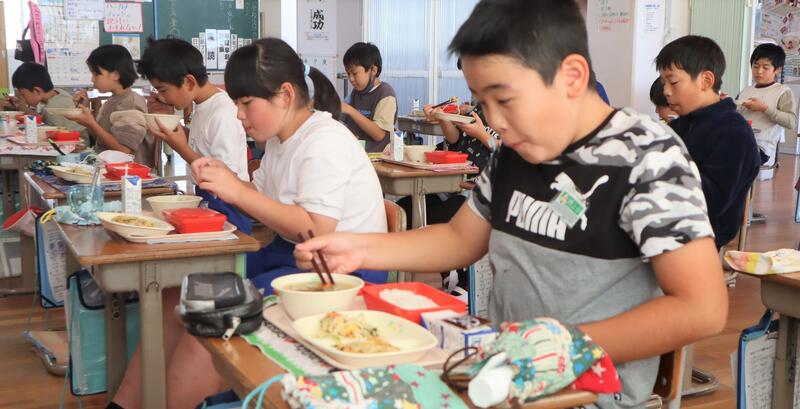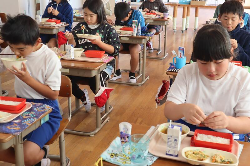 今日は5年生の給食の様子をお知らせします。なお、本日予定していた「もち麦」は、都合により「白米」に変更となりました。子どもたちは、今日もよく噛んで食べました。おいしかったね。