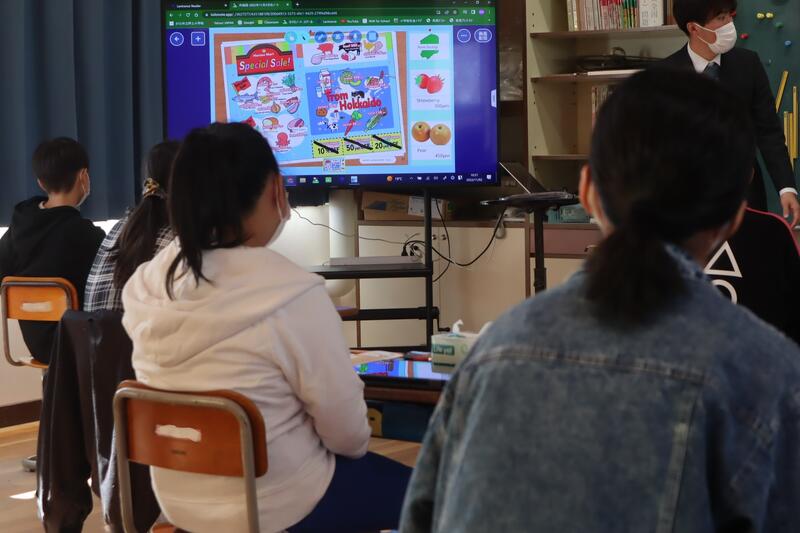 「What … do you like?」「I like ~.」という表現を使って、相手に好きなものを聞いたり、自分が好きなものを相手にわかるようにはっきり伝えたりすることをねらいとしています。子どもたちは、お店屋さんとお客さんに分かれて、好きな食べ物や飲み物、色について、相手に聞いたり、聞かれたことにしっかり返答したりしていました。楽しそうに会話をしているのが印象的です。いいぞ、いいぞ!3年生(^_-)-☆