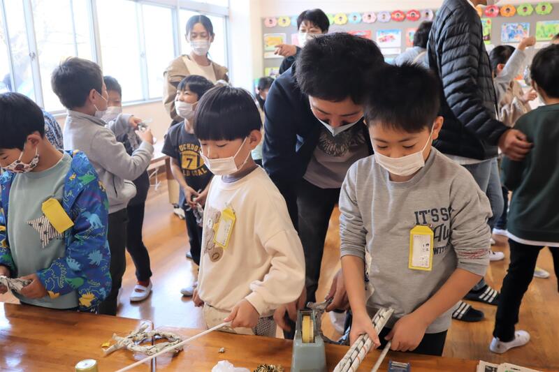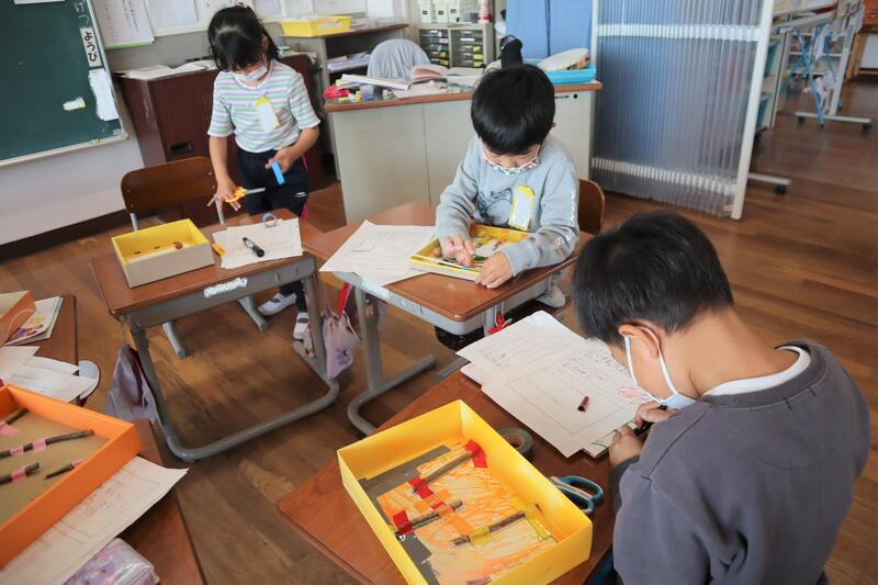 2年生の生活科「うごく うごく わたしの おもちゃ」の授業の様子です。子どもたとは、身近にあるものを使い、動くおもちゃを作成します。その動くおもちゃを作りながら、友だちと競争したり、工夫を教え合ったりして、よりよく動くように改良していきます。この単元では、これらの活動を通して動くおもちゃの面白さや不思議さを実感するとともに、遊び方を工夫して、みんなで遊びを楽しむことをねらいとしています。みんな真剣な表情で取り組んでいます。