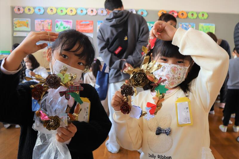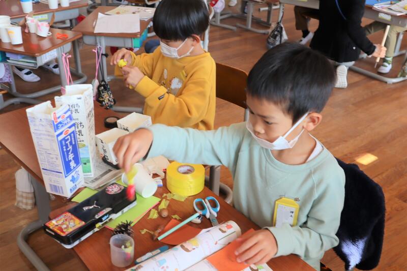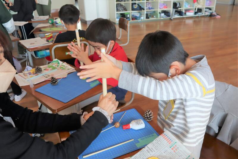 子どもたちは、どんぐり迷路、まといれ、まつぼっくりのけん玉・・・いろいろなものを作っていました。