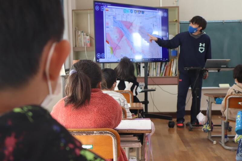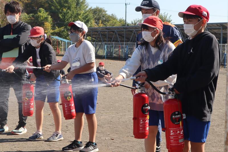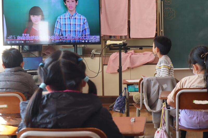 また避難訓練の後には、防災学習として2,4年生がスモーク体験を、6年生は水消火器体験を行いました。1・3・5年生は教室で「洪水から身を守るには」の動画視聴を行い、避難所やハザードマップの確認などを行っていました。