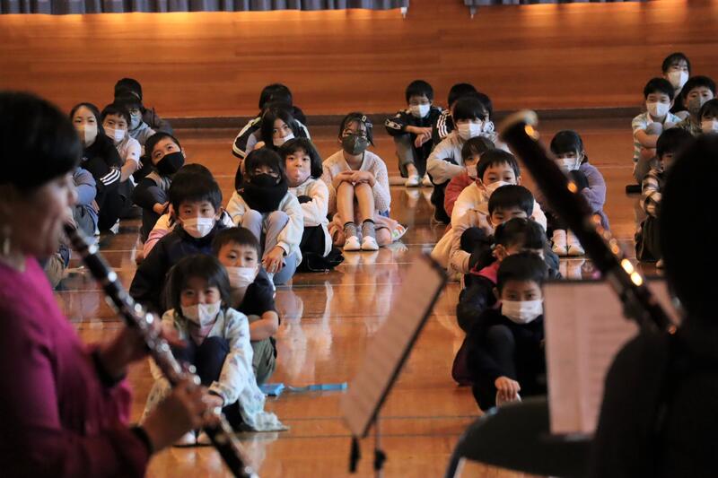 鑑賞会では、トマジ作曲「田園のコンセール」やモーツァルト作曲「ディヴェルティメント」のほか、子どもたちも耳にしたことがある「さんぽ」や「きらきら星変奏曲」などを演奏してくれました。