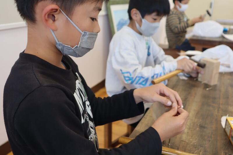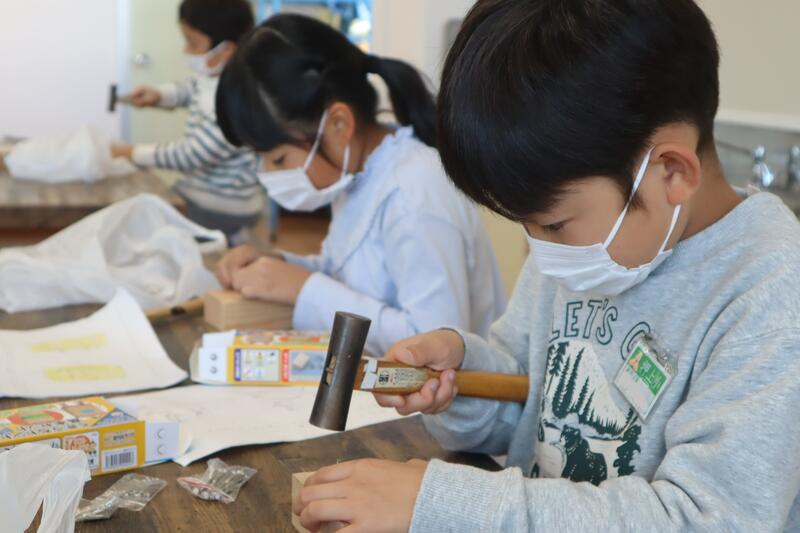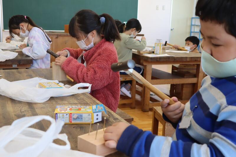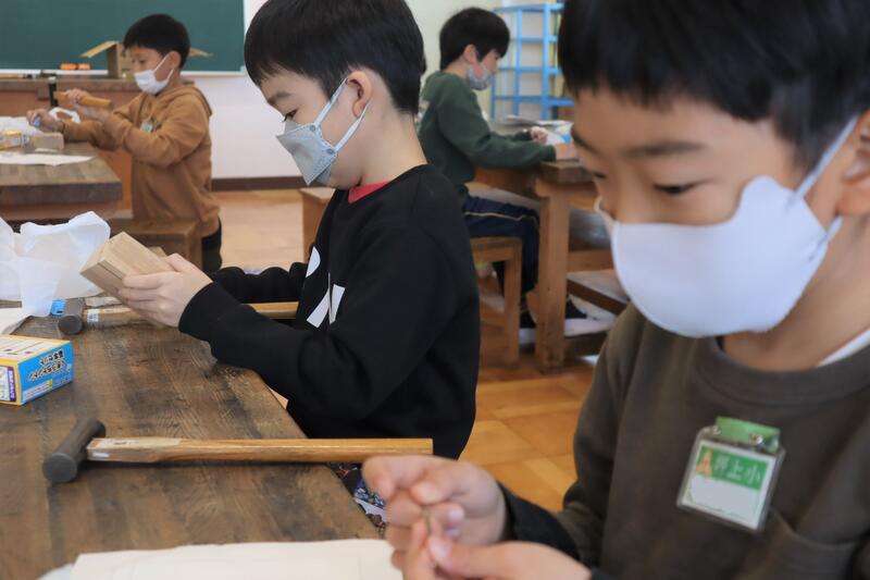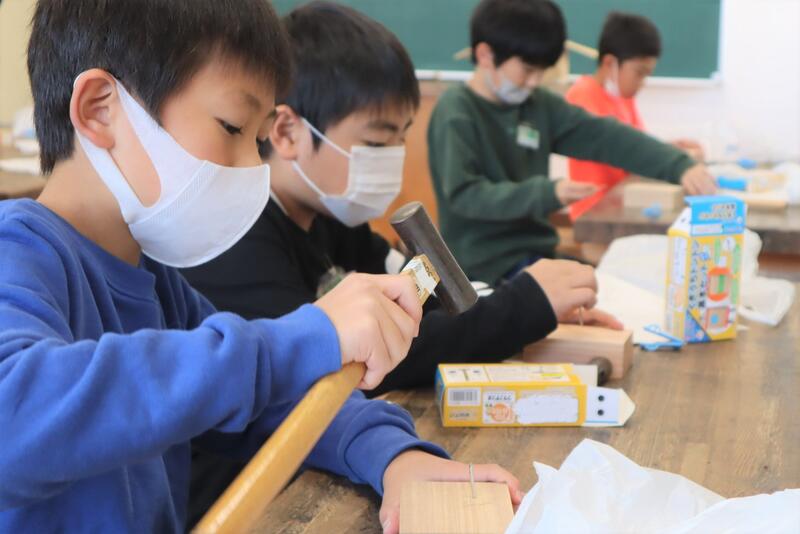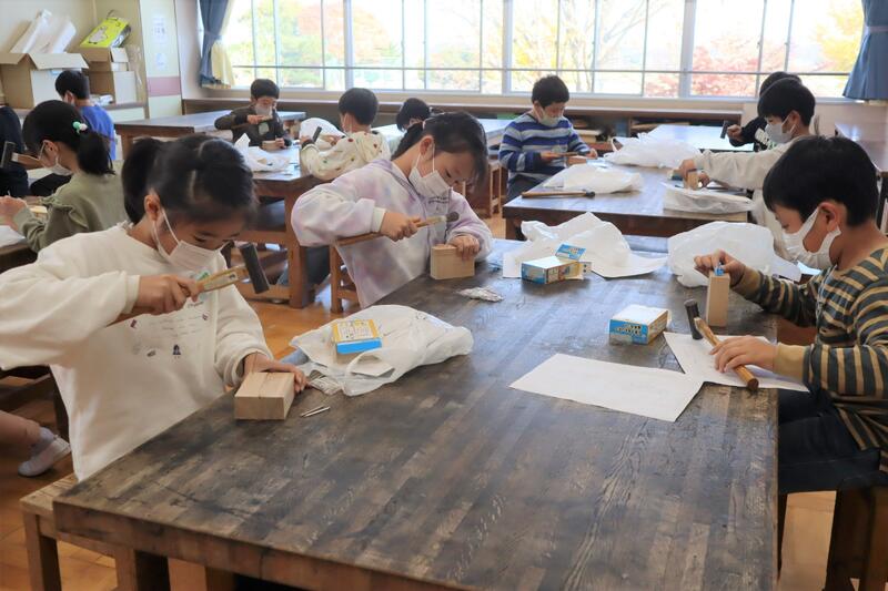 3年生の図画工作「くぎうちトントン」の授業の様子です。3年生が図工で釘を打つのは初めてです。この単元では「金づちを安全に使い、釘の打ち方を工夫すること」や「金づちで木材に釘を打つ活動に楽しんで取り組むこと」をねらいとしています。子どもたちは、動物や乗り物など、思い思いの作品をつくりながら、釘打ち体験を楽しんでいました。