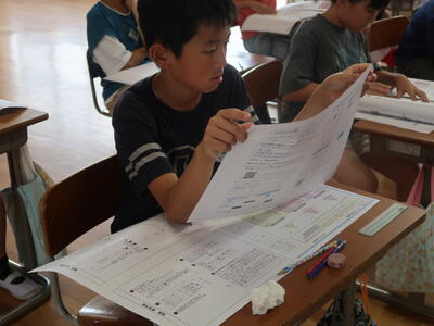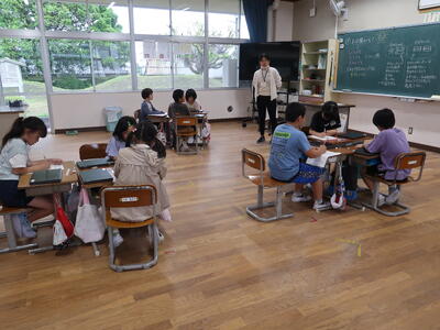 6年生の教室で、子どもたちがグループになっていろいろ話し合っていました。