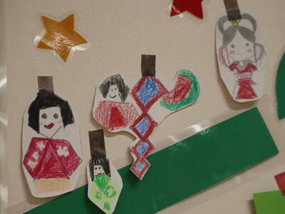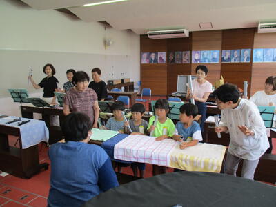 この子は、服を作っていたのですが、袖を通す部分を、新聞紙を折って半円にちぎって、それを広げて丸を切り抜いていました。作り方の工夫ですね。できあがった服に袖が通せてとてもうれしそうでした。