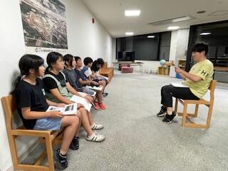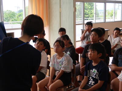 はじめに体育館で「浮いて待つ」のポイントなどをお話しいただきました。(調べてみたら、今は、外国でもこの「浮いて待て」が広がっているようです。英語表記でも「UITEMATE」だそうです。それから蒸し暑い日でしたが、体育館の空調のおかげで気持ちよくお話を聞くことができました。)