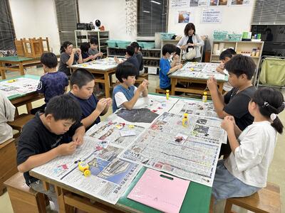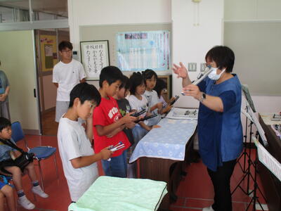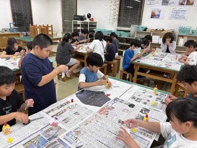 ※本校は今年度、市教育委員会から「複数担任制の準備に向けた実践研究」の指定を受けています。研究の一環として、2学年(または3学年)合同の授業や活動を行ったり、授業担当者を担任以外の先生が行う機会を増やしたりするなど、多くの教員が多くのクラスに関わるようにしています。今回の記事の4年生の図工も3年担任が授業を担当しています。