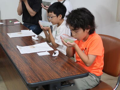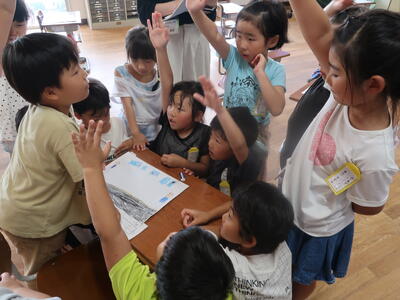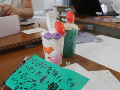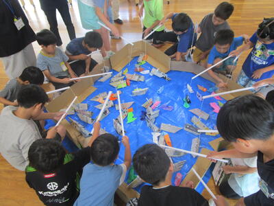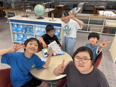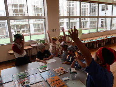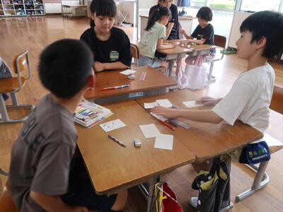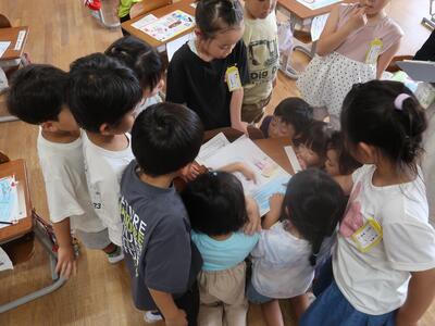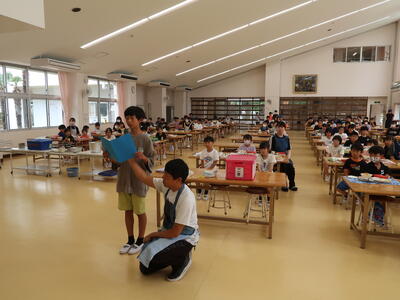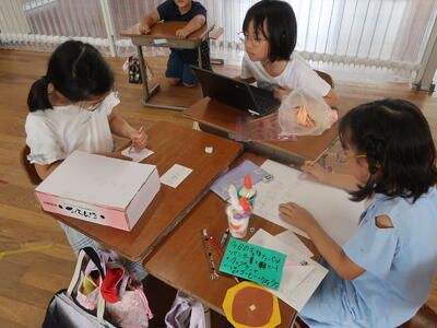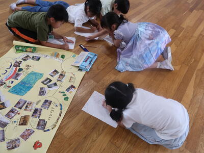 終わったあとはふり返りです。1~3年生はランチルームで振り返りをしていました。「全部回れたよ!」「これをつくったんです!」と教えてくれました。とても楽しかったようですね。