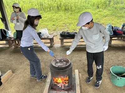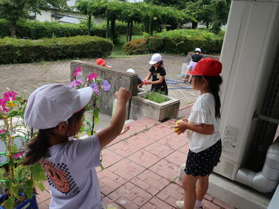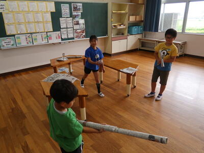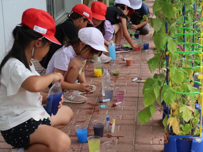 1年の生活科「なつがやってきた」の単元に「みずであそぼう」という活動があります。夏の自然を生かして身近な自然や物を使って遊んだり、その中で遊びを作り出す楽しさを味わう活動です。ペットボトルやマヨネーズ・ソースの容器を水鉄砲にして的当てゲームをしたり、シャボン玉遊びをしたりしました。暑い夏を感じながら、水遊びを大いに楽しんだようです。
