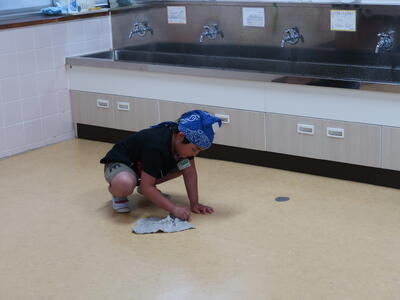 高学年児童を中心に進めます。分担が決まったら、さっそくお掃除開始。はじめての場所の子もいれば、「ベテラン」の子もいます。