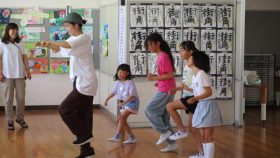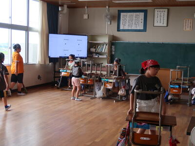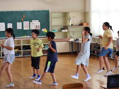 6年生はこの時間外国語の授業でした。相手の出身や住んでいるところを聞いて答える活動で、「Where are you from?」「I'm from ~.」「Where do you live?」「I live in~.」のやりとりをします。でも、単なるやりとりではなく、「ゾンビゲーム」の要素を取り入れ、内緒の何人かが最初のゾンビとして選ばれゲームスタート。出会った人とじゃんけんをしてゾンビの子が答える側になると、相手もゾンビになるルールのようでした。誰がゾンビなのか分からない、ゾンビの子は「ポーカーフェイス」でどんどん友だちにアプローチします。最後は、ゾンビになった人を確認、そして最初にゾンビだった「ファーストゾンビ」の子を種明かしして終了です。とても盛り上がりながら、学んでいました。