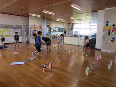 これは、4年生以上で組織している委員会活動でイベントを企画して、全学年児童が体験し交流を深める内容です。集会のテーマは「楽しくチャレンジ」。これまでは委員会の仕事を体験できるようなイベントでしたが、「今年度は委員会の仕事に関係なく、チャレンジイベントを企画して、児童会として楽しいひとときとなるように」とのコンセプトで企画し準備し実施しました。(でも、子どもたちは自分の委員会に関連するイベントを企画したところも多かったようです。)