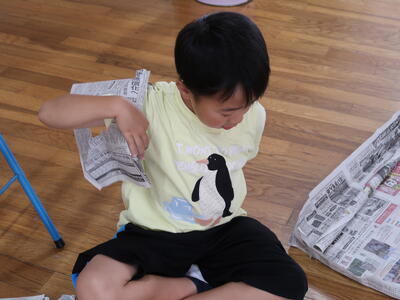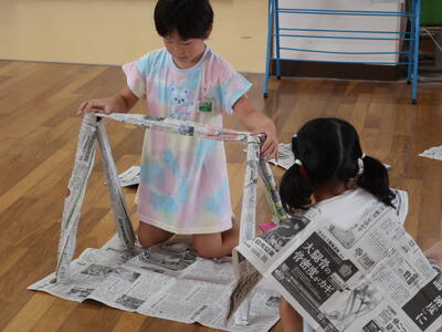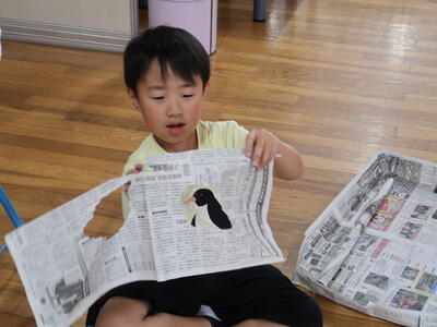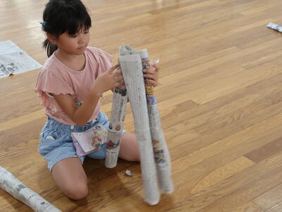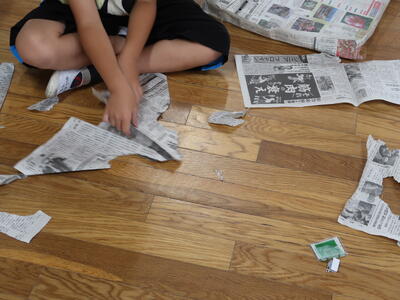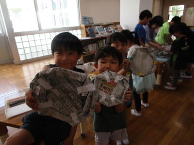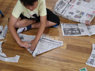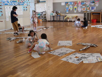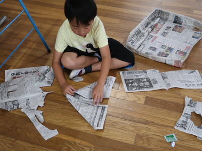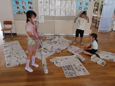 新聞紙を切ったりやぶいたりはったりしてあったらいいなというものをつくり出します。テントをつくる子、バットやグローブをつくる子、剣をつくる子、また服をつくる子もいます。つくったらいろいろ遊ぶ中で、これがね・・・と自分の物語を話していたり。想像をふくらませている子もたくさんいます。