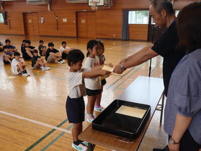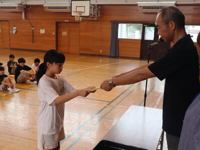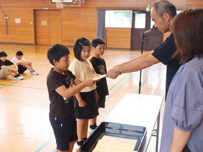 次回は9月に松の実賞表彰を行う予定です。子どもたち一人一人のそれぞれのよさが、すてきな押上小学校をつくりあげていると思っています。そうそう、「呼ばれたときの返事、みんなのあいさつもよくできていてすばらしいですね。」と進行の先生からお褒めの言葉もいただきましたね。こんな姿からも、さらによりよい押上小学校になっていることが分かります。うれしいことです。次の表彰を私も楽しみにしています。