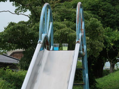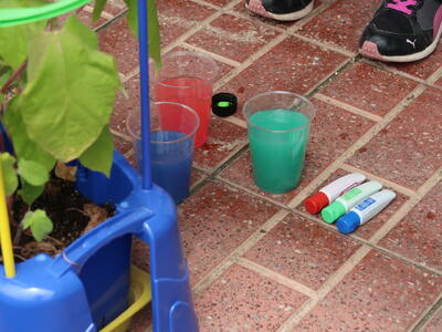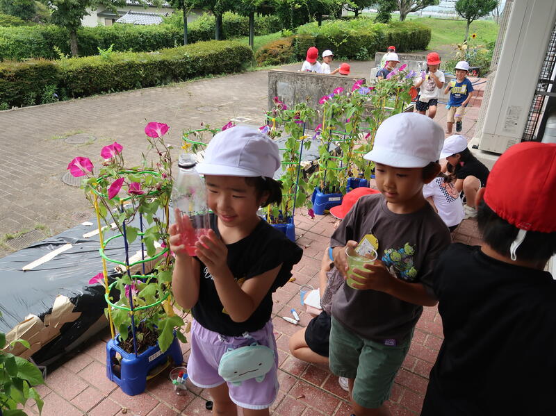 自分で好きな色水をつくって楽しみます。友だちの色水に興味をもったり、つくった色水を教え合ったり。そして自分でつくった色水をとても愛おしそうに見ています。すべり台のてっぺんにつくった色水を置いている子も。下から見上げてみると光をとおしてきれいに見えるから不思議です。