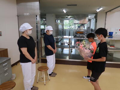 本校にはランチルームがあり、ランチルームと調理室がつながっていて、毎日「いただきます」「ごちそうさまでした」を直接調理員さんに伝えていました。そのようなこともあり、15日(火)給食後、ランチルームにて、お世話になった調理員さんと調理室に感謝の気持ちを表す感謝の会を実施しました。児童を代表して、給食委員会委員長の児童が感謝の言葉を伝え、そして代表児童によるお花の贈呈そして、みんなで「ありがとうございました」を心を込めて伝えました。