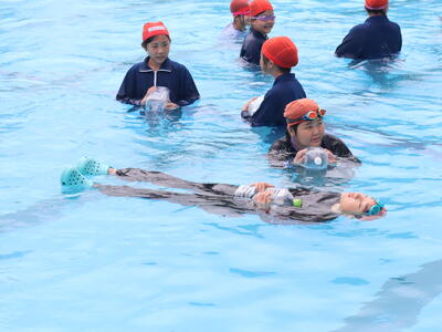 17日(木)、昨年度に引き続き、5・6年生が水泳授業の締めくくりとして「着衣水泳」講習を行いました。講習では、水難学会の方々を講師にお招きし、指導をいただきました。