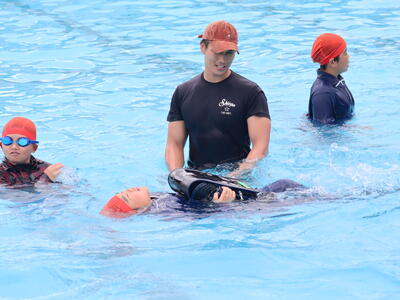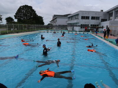 続いていよいよプールでの「浮いて待つ」の体験です。靴や服を身につけて水に入ったときの感覚や、ペットボトルを使って水に浮く体験をしました。人が水に浮くときには体の2パーセントしか水面から出ません。98パーセントは沈んでしまいます。その2パーセント分をできるだけ顔にして(息ができるように鼻と口の部分を出して)、「浮いて待つ」ことが大切ということを学びました。例えば「助けてー」などと手を出してしまうと、手が2パーセント分になってしまい大切な顔の部分は沈んでしまうわけです。学会の皆さんの見本・手本を見たあと、自分たちでやってみます。学会の方がコツを丁寧に教えてくれます。