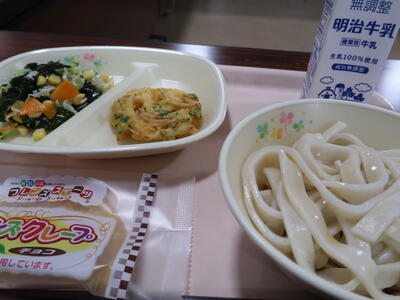 最後の自校給食メニューは、冷やしサラダうどん、かき揚げ、チョコクレープ、牛乳でした。