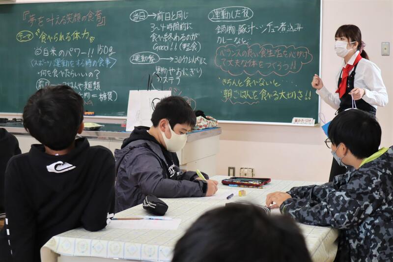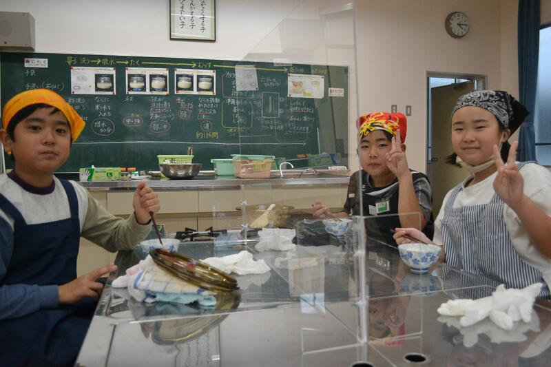 今日は5年生の給食の様子をお知らせします。なお、本日予定していた「もち麦」は、都合により「白米」に変更となりました。子どもたちは、今日もよく噛んで食べました。おいしかったね。