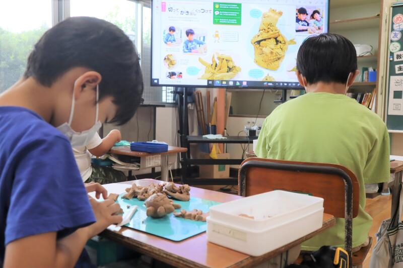 3年生の図画工作「切って かき出し くっつけて」の授業の様子です。子どもたちは、 ”きり糸” や ”かきべら” などの用具を使って粘土の形を変えながら、思いを形(立体)に表しています。