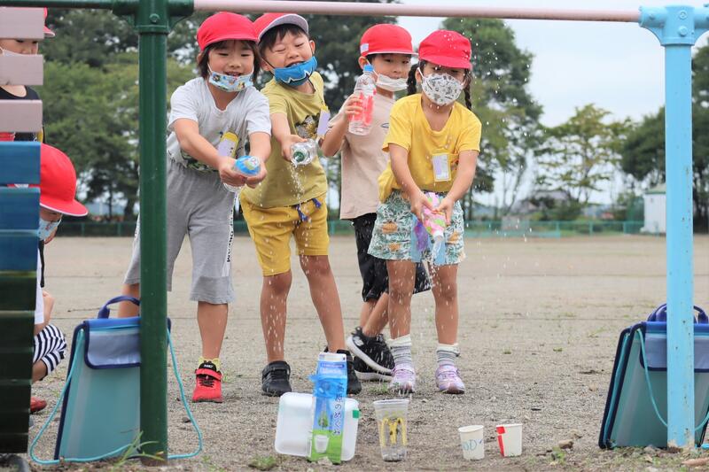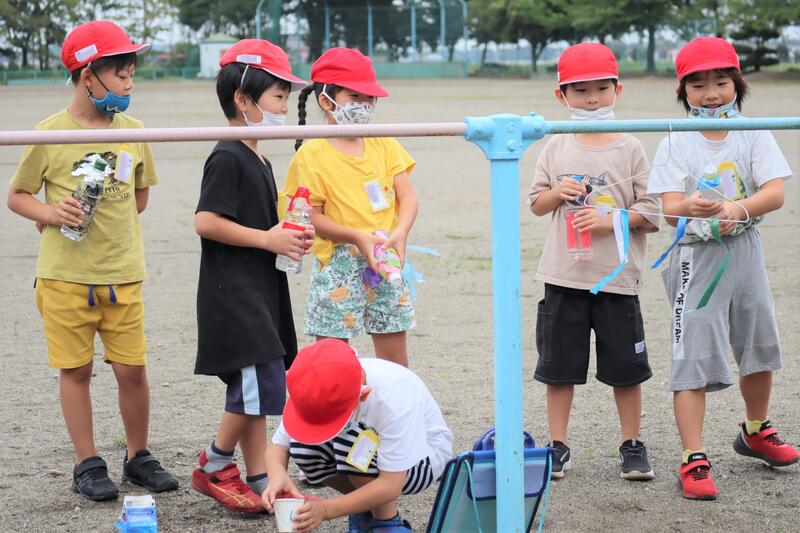 1年生の生活科「みずで あそぼう」の授業の様子です。子どもたちは、家から持参したマヨネーズやケチャップ、ペットボトルなどの空き容器に穴をあけたり、色を付けたりしてイメージを膨らませ、さらに、手作りの的を作成して「みずで あそぼう!」を楽しみました。いろいろと試行錯誤しながら取り組んでいます。