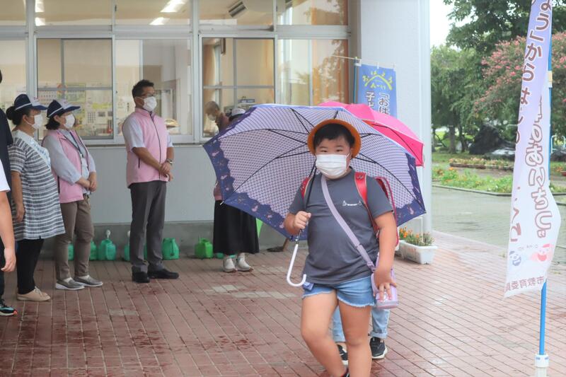 本日9/7(水)朝、あいにくの雨模様でしたが、その「わわわ隊」のみなさんが、本校昇降口の前であいさつをして児童を迎えてくれました。登校後の6年生児童も加わり、笑顔で『元気に』あいさつする姿が見られました。