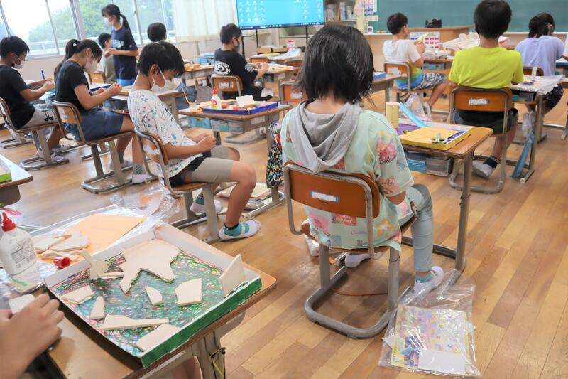 1年生の図画工作「おって たてたら」の授業の様子です。この題材は、紙を折って立てた形から楽しい様子を想像し、立て方や切り方を工夫しながら表したいものをつくることをねらいとしています。子どもたちは、思いのままに材料を切ったり色を塗ったりしながら、自分が思いついた表し方を試しにやっています。自分なりにいろいろと活動しながら作品のイメージを修正し、自分が作りたいものに挑戦していました。(^O^)/