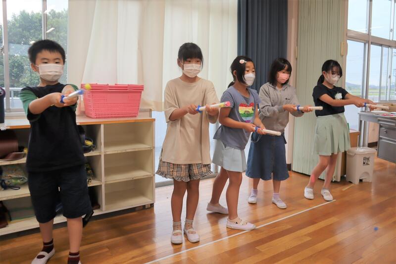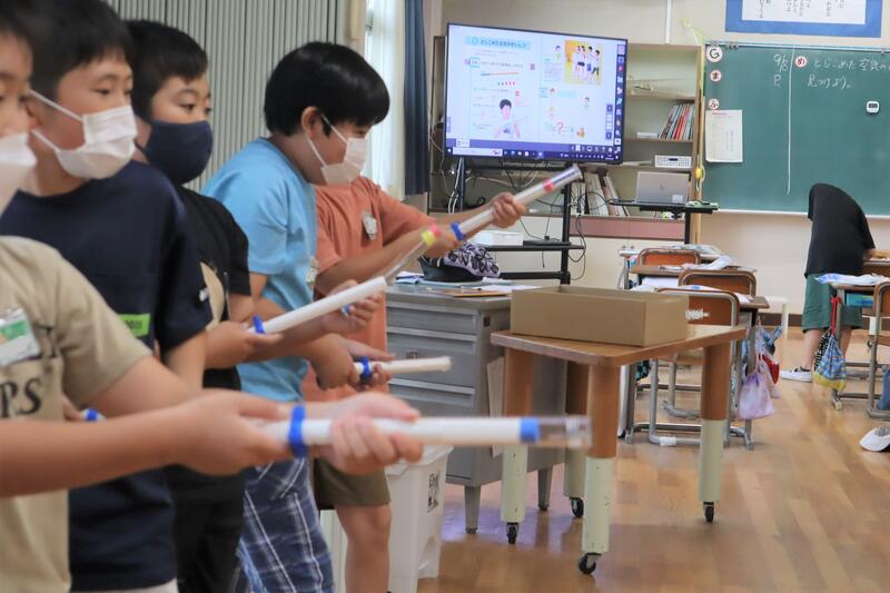 4年生の理科「とじこめた空気や水」の授業の様子です。今日は「とじこめた空気のせいしつ」を学ぶ時間で、子どもたちは空気でっぽうで玉を飛ばす実験をしていました。前玉と後玉の距離を変えると(短くしたり長くしたり…)前玉の飛び方はどうなるか?予想しながら実験していました。次の実験も楽しみ(^_-)-☆です。