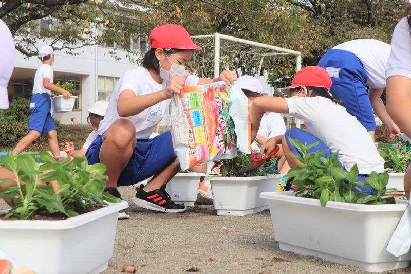 今日は、高校生や県内の花き生産者等が育苗したポット苗(ニチニチソウ)を子どもたちがプランターに定植しました。今後、会期に合わせて競技会場に運搬されるまで、学校で水やりなどの管理をします。みんな”おもてなしの心”で、ていねいに花苗を植えました。きれいに育つとうれしいですね。(^O^)/