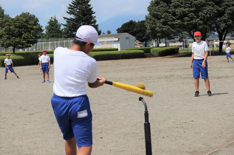 5年生の体育「ベースボール型(ティーボール)」の授業の様子です。子どもたちは、ボールを打ったり走ったりして攻撃することや、それを阻止するために捕球したり集まったりして守備をし、楽しみながら試合をすることができます。運動に進んで取り組み、ルールを守ったり、友だちと助け合ったりして活動していました。(^O^)/