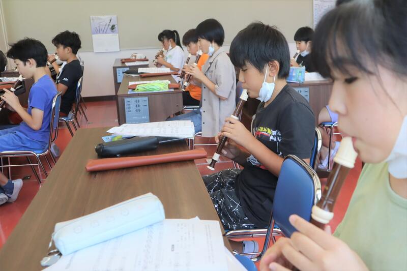 本題材は、旋律を様々に組み合わせながら楽しく歌ったり合奏したりする学習です。「ロック マイ ソウル」では短い3つの旋律を組み合わせて音の重なりを感じ取るなど、声のひびき合いを楽しんでいました。また、「カノン」は多くの人が一度は耳にしたことのある曲。卒業式のBGMに使われることも多いことでも知られています。リコーダー本来の柔らかい音色のひびきを合いから、優しい雰囲気が伝わってきました。