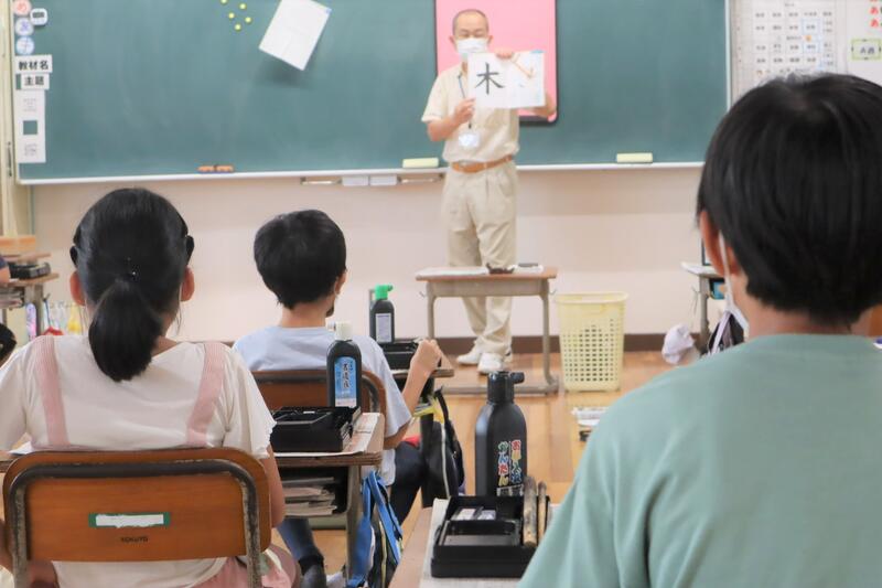 3年生の書写「左はらいと右はらい」の授業の様子です。毛筆で「木」を書くには、左はらいと右はらいの書き方を理解した上で、筆圧などに注意しながら書くことが大切です。今日は左はらいと右はらいのときの筆圧について注意しながら書いていました。