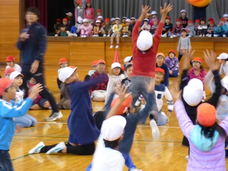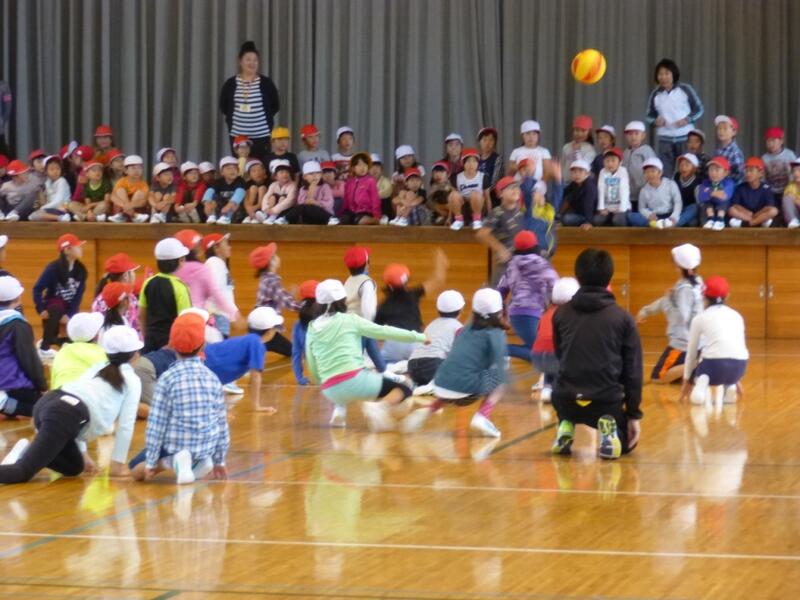 1年生から4年生は、体育館で、座ってボール回しをしたり、中央にあるカラーコーンを触って走るゲームをしました。