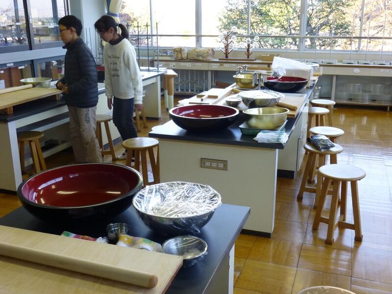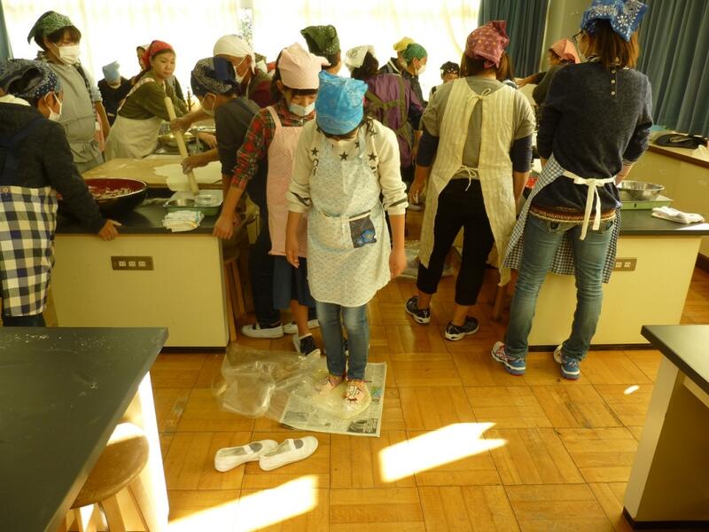 6年生は、うどん打ちを行い、けんちんうどんの材料を作りました。粉をこねて、 上手に伸ばして、食べやすい太さに切りました。