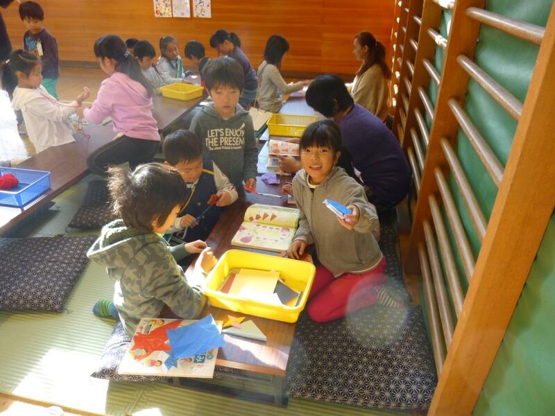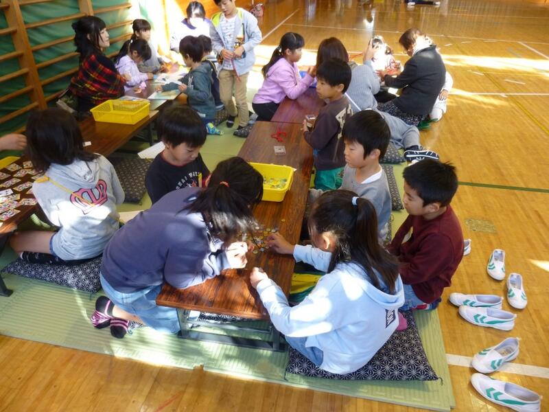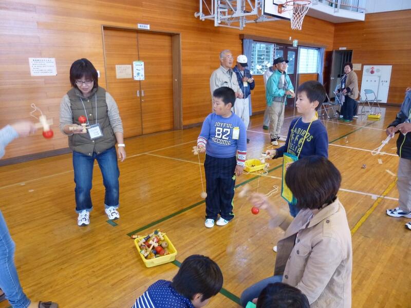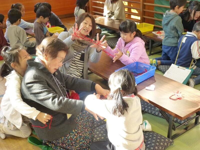 1年生と2年生は、体育館で、保護者や明友会の方々と昔の遊びで交流をしました。ケン玉、コマ、輪投げ、お手玉、折り紙、あやとり、おはじきなどで、楽しい時間を過ごしました。