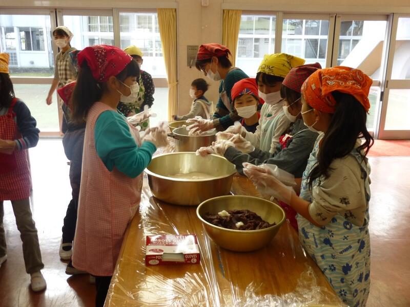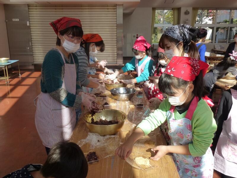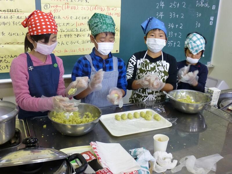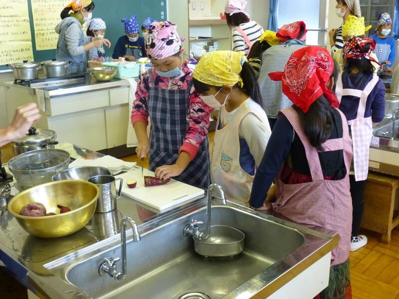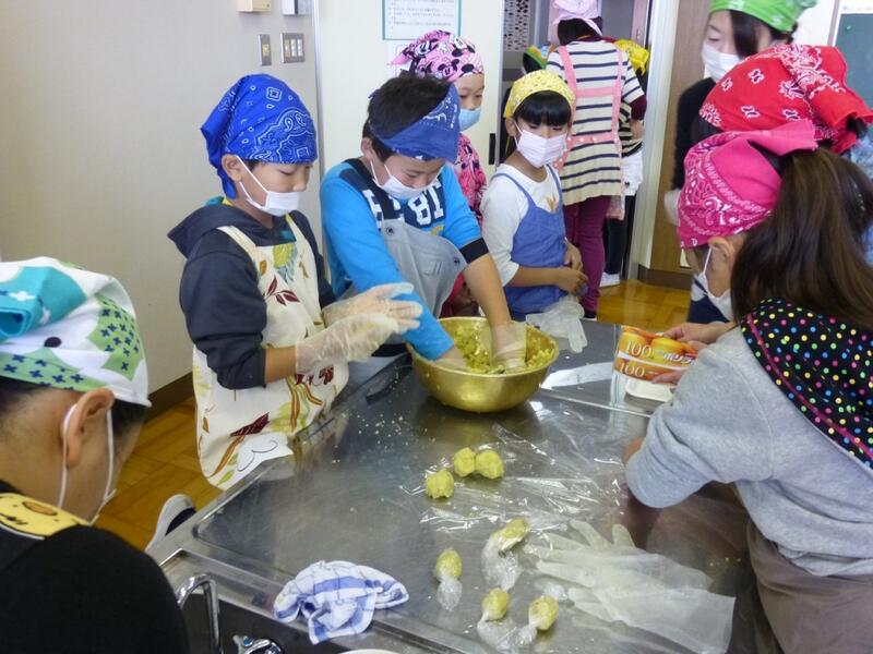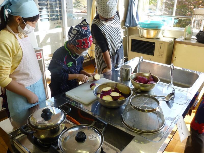 3年生と4年生は、学校の農園で、1年生から4年生までが育てたサツマイモを使い、スイートポテトを作りました。サツマイモを切り、茹でて、大人の人に教わりながらおいしそうなスイートポテトを作りました。