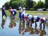 晴れわたった青空の下、5年生が総合的な学習の時間の一環として、学校北側の水田で、田 植えを行いました。
