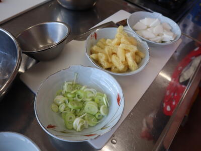 味噌汁は、具材が大根、油揚げ、ネギです。まず具材を切ります。包丁さばきに苦戦している子、器用にこなしている子など、さまざまです。だしは、煮干しから取ります。 だしが出たら具を入れ、火が通ったか確かめて、最後に味噌を入れます。味噌も、煮ている汁で溶かしてから入れて、溶きやすくしています。