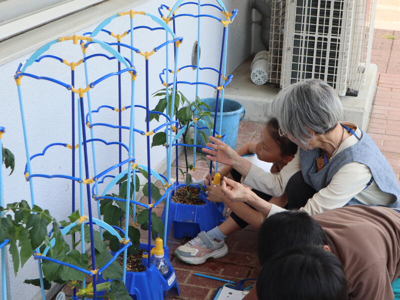 毎日水やりを欠かさず、大切に育ててきた野菜を、これからも元気に育てていくにはどうするとよいか、どんな病気に気を付けないといけないか、それから、すでに実を付けた野菜もあって、どうすると実が付くのかなどをお話ししてもらいました。