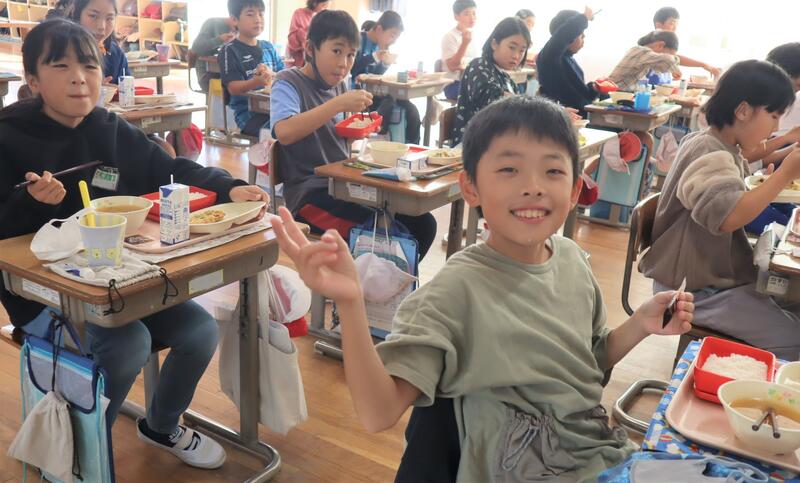 今日は5年生の給食の様子をお知らせします。なお、本日予定していた「もち麦」は、都合により「白米」に変更となりました。子どもたちは、今日もよく噛んで食べました。おいしかったね。
