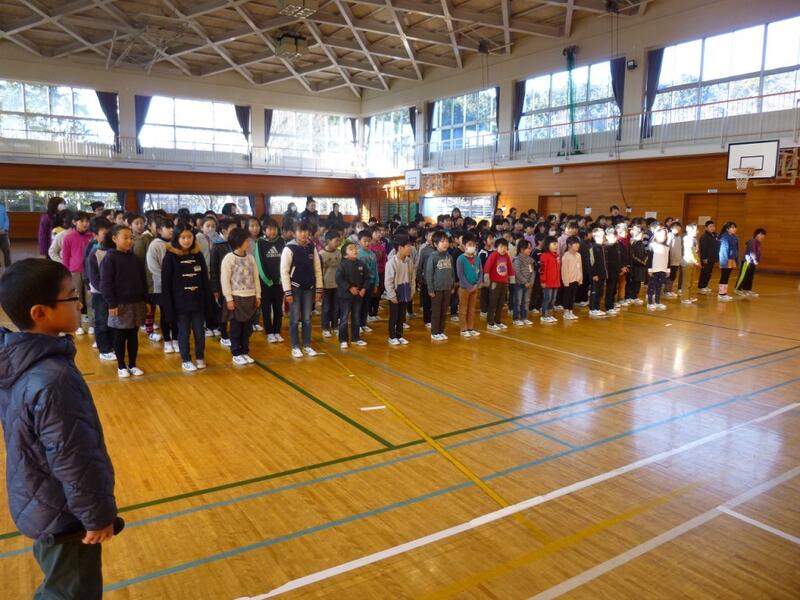 まず、全校生で1月の歌「冬の歌」を歌いました。