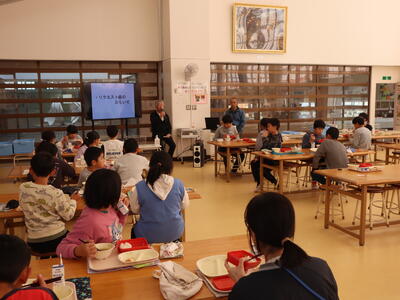 今回の学校運営協議会委員さんは、元PTA会長さん、交通指導員さんでもあるHさんです。委員さんには早めに来てもらい、校長室で一緒に給食を食べていただきながら、まつDの打合せです。打合せでは本校の昔の様子やこの地域の昔話などに花が咲きました。私にとっても興味深いお話で、まつDでも子どもたちにお話ししてもらいました。給食も、すまし汁の味付けが薄めで子どもたちにもいいですねとお褒めの言葉をいただきました。