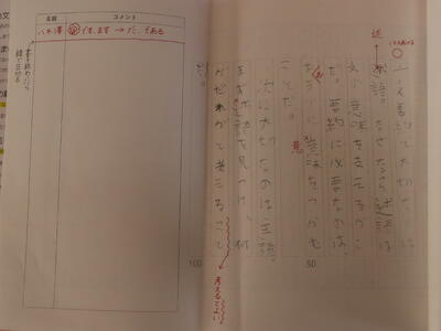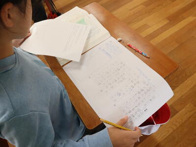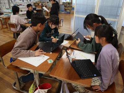 この時間は、文章の構成を押さえ、内容の大体を捉えて、要約する学習でした。大人でも要約して文章に表すことはとても難しいと思いますが、子どもたちは自分で、また、友だちのアドバイスも得ながら取り組みました。お互いに読み合って「ここいいね」とよいところを伝えたり、「ここをこうするといいよ」とアドバイスしたりする活動があって、学び合う・協働的に学ぶ場面がとてもいいなと思いました。