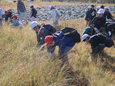 その後、バスで氏家大橋上流の鬼怒川河川敷に移動し、絶滅が危惧されているシルビアシジミ(蝶)やカワラノギクなどの動植物を守るため、外来植物のシナダレスズメガヤの抜き取り作業を行いました。