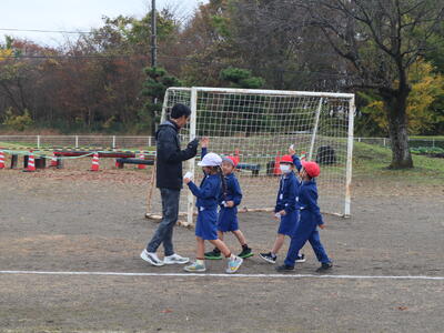 的場さんは、子どもたちと一緒に準備運動やアップ、そして本番では伴走をしていただきました。走り終わった1年生一人一人に「がんばったね」のハイタッチ(うれしいプレゼントですね。2年生以上は昨年してもらったと思います。)。子どもたちは先輩からのプレゼントにとてもうれしそうにしていました。