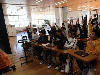 本校の6年生17名と東京側の墨田区立押小児童(約100名の3クラス!)が参加し、画面越しにお互いの地域や学校のことを発表し合い親睦を深めました。