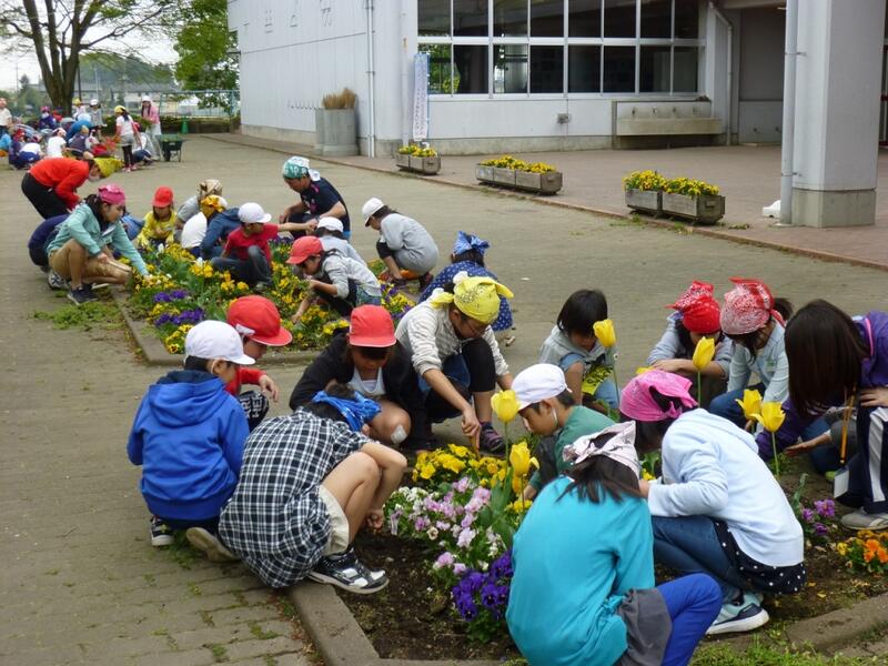 4月27日(水)の昼休みに、なかよし班(縦割りの班)の活動として、グリーンタイムを行いました。気温が高くなり、雨も続いたので、花壇の雑草が伸びてしまいました。