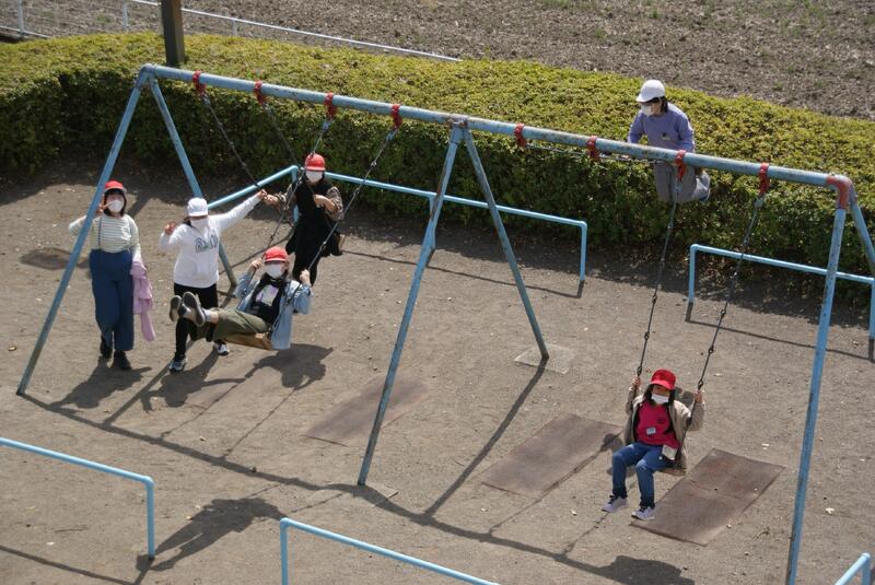 走り回って疲れた後は、ソーシャルディスタンスで休憩です。